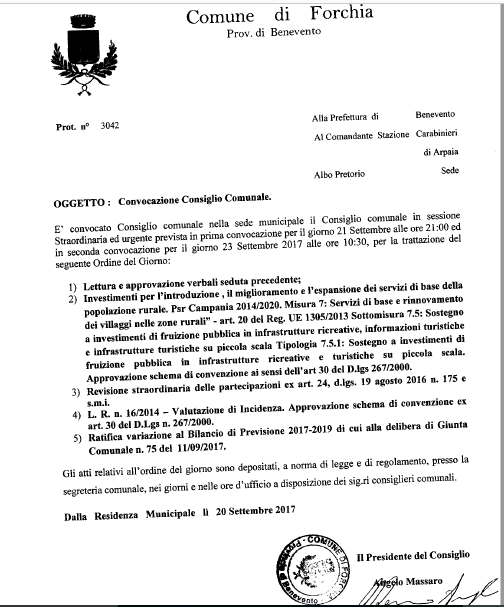 Il Consiglio è stato chiamato ad esaminare la stipulanda Convenzione tra i Comuni di Forchia, Bonea, Paolisi, Bucciano ed Arpaia al fine di accedere ai benifici di cui al P.S.R. 2014-2020 della Regione Campania. La costituzione dell'associazione dei Comuni è finalizzata alla predisposizione del progetto di realizzazione del centro turitistico Versante Sud del Taburno. L'intero Consiglio si esprime favorevolmente.